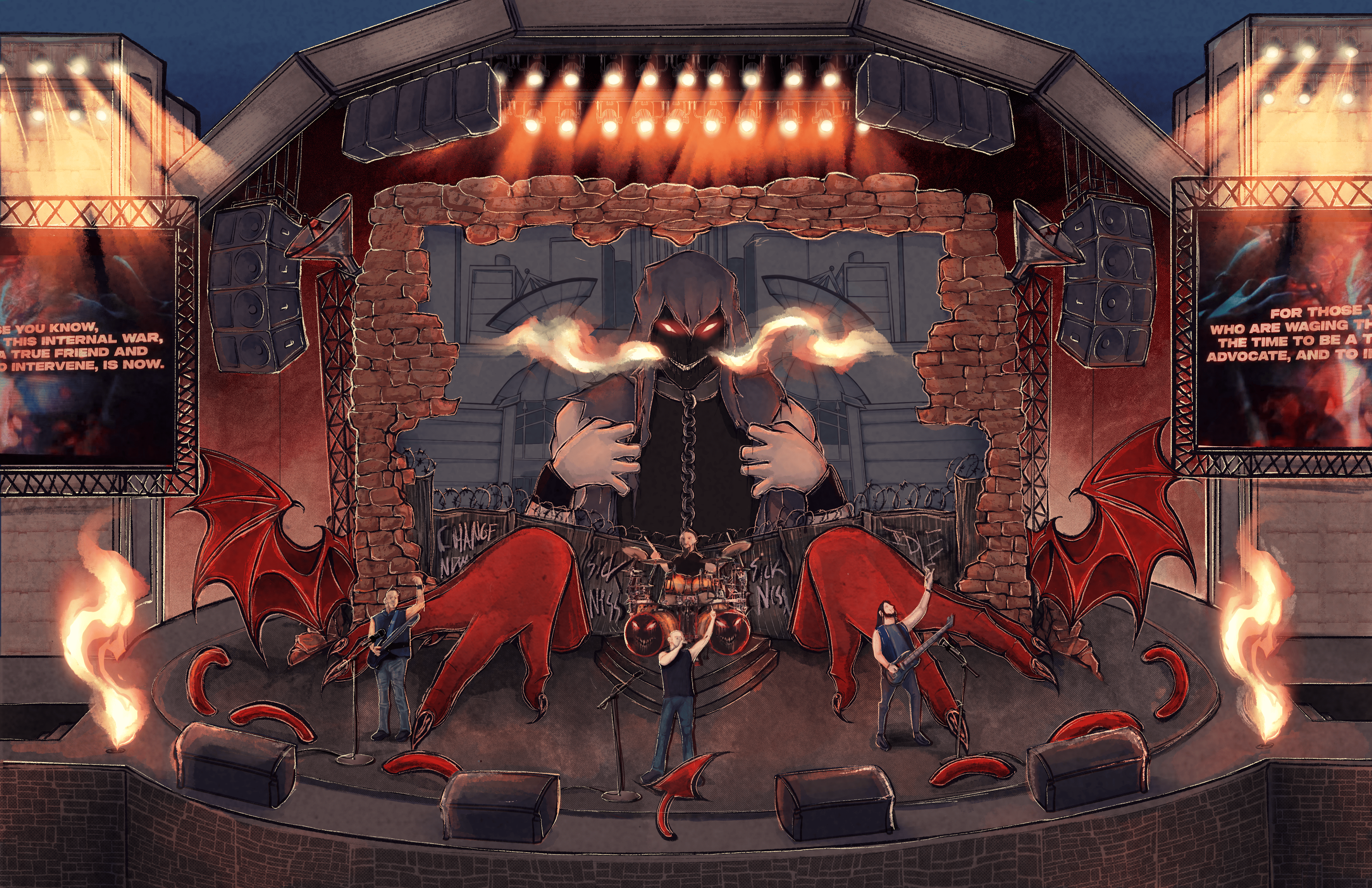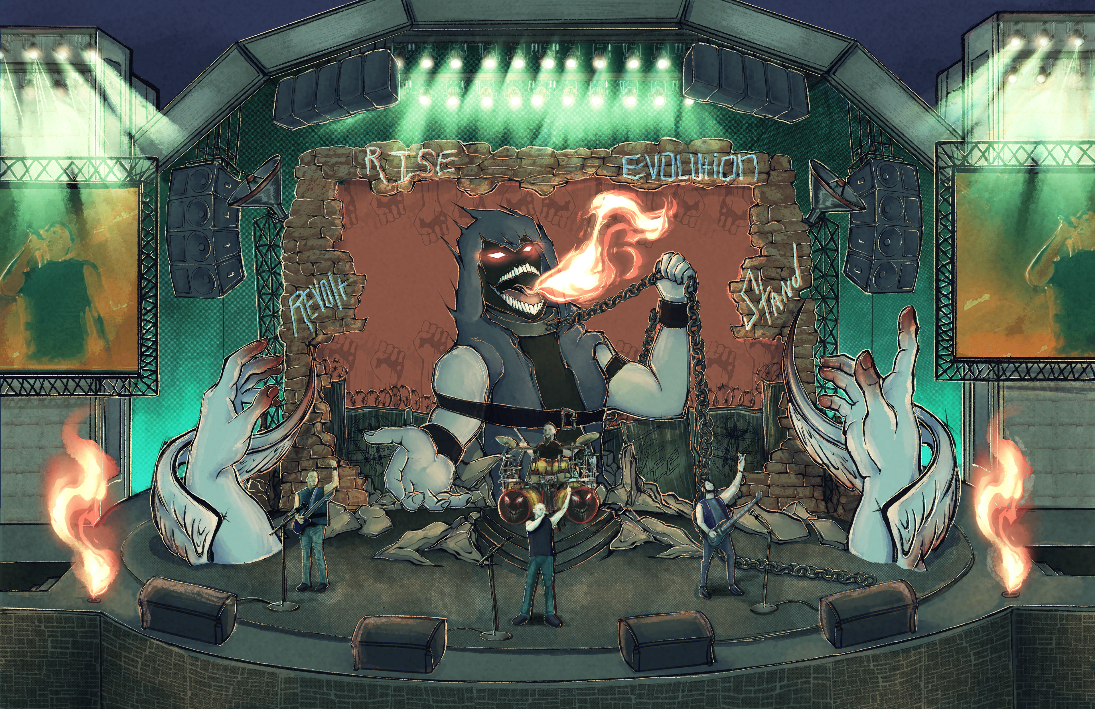 Part 1: This would be the first part of the show, showing “the guy” trapped in a stagnant position confined to fences, brick, and barbed wire in a city that references a big capitalist city in a previous music video. He is grappling with himself as he slowly begins to awaken, seeing the poor condition the world is in. All the while, large demon hands (a combination of a demon motif in their music and monsters in my artwork) loom over the band, very present and embedded into the stage. The colors of the lighting are inspired by an earlier album of theirs, Indestructible.