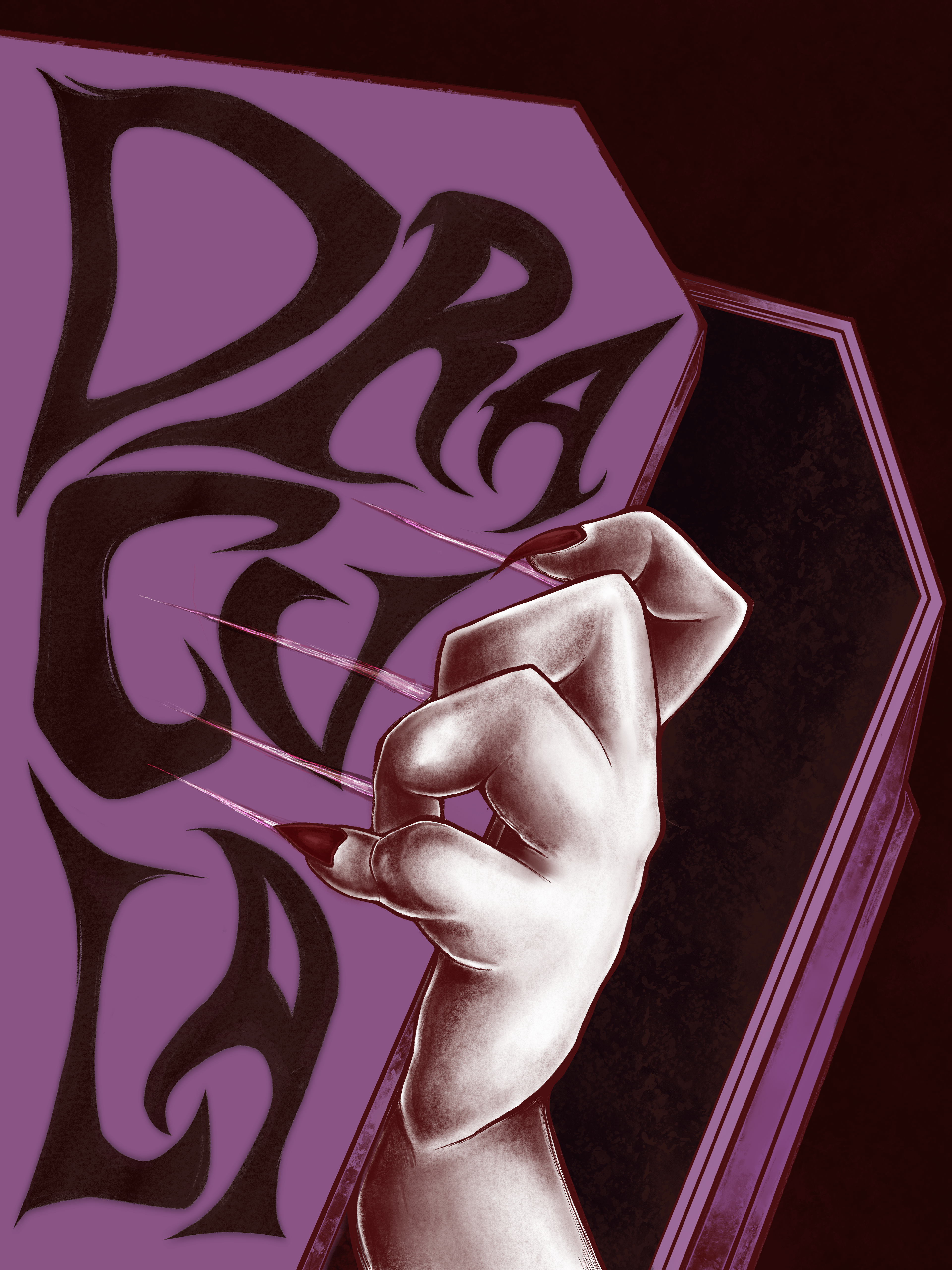 When tasked with creating a piece ustilizing symbolic imagery in a new way, I chose to have my poster be inspired by the 1897 novel “Dracula” by Bram Stoker. Despite referencing such a well-known piece of literature, I wanted to introduce a new interpretation and representation of the character. I chose to do so by visualizing the vampire’s hand as it lifts up a coffin paired with a loose yet sharp free-form text that echoes the sharpness of sharp fangs and nails.