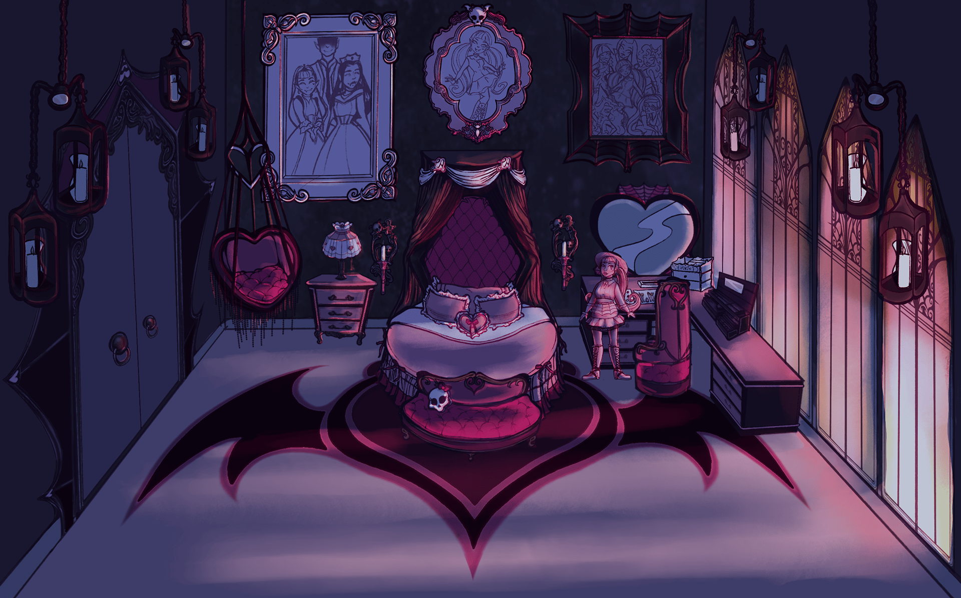 I wanted to explore all of her interests while exploring what the aesthetics of her room would look like as a forever-young teenager who has lived for hundreds of years that adores all things pink, bat-themed, and can afford practically anything she wants. This included a lot of handmade furniture with Victorian touches here and there, while holding a generally macabre look.