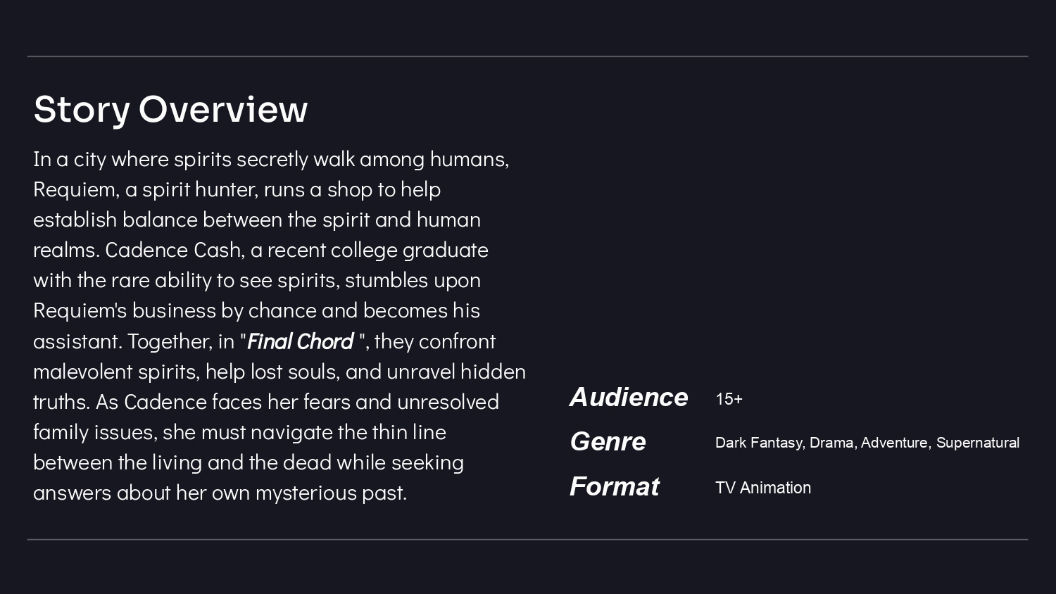 Together, in "Final Chord", they confront malevolent spirits, help lost souls, and unravel hidden truths. As Cadence faces her fears and unresolved family issues, she must navigate the thin line between the living and the dead while seeking answers about her own mysterious past.