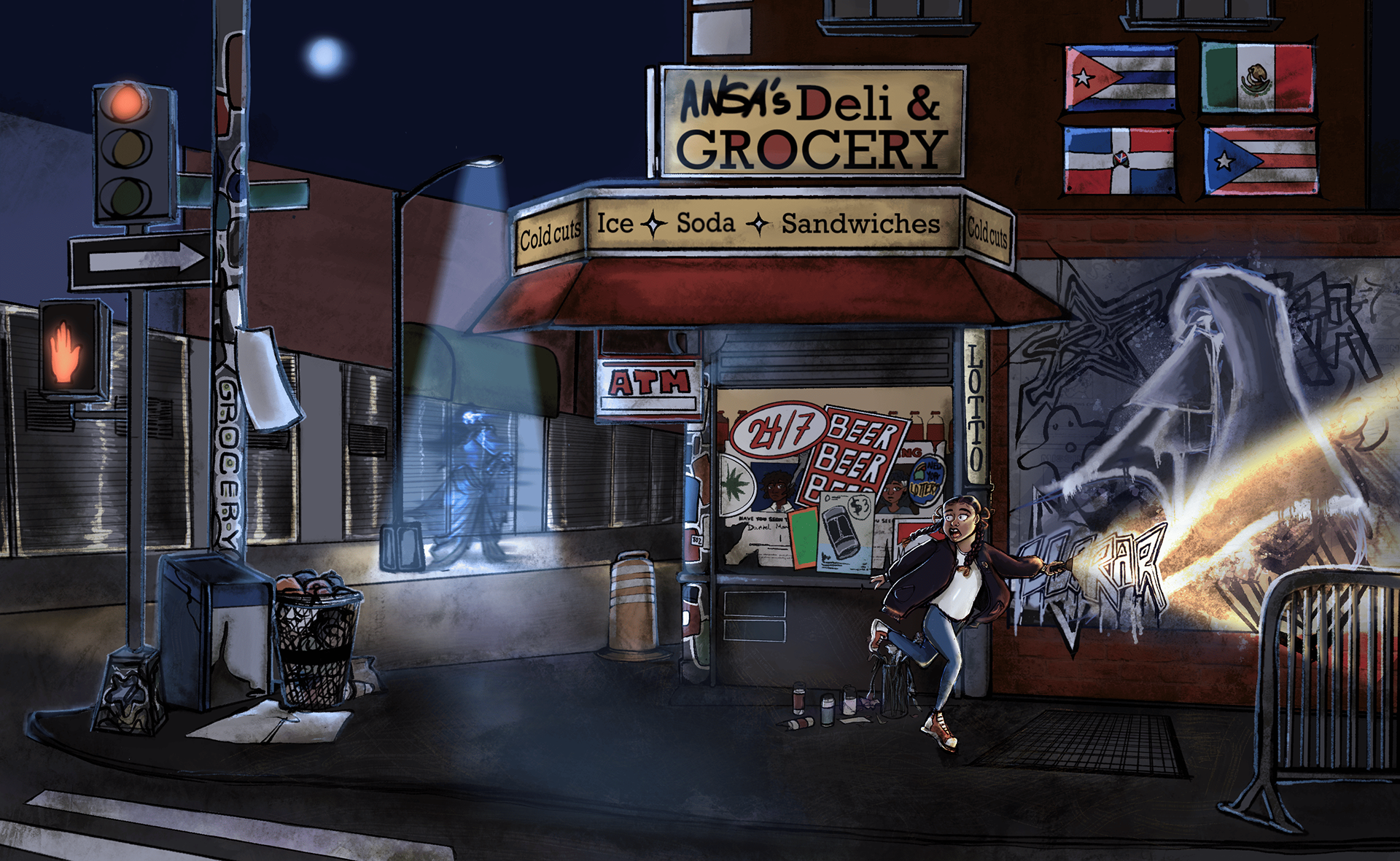 With this setting, I wanted to explore a familiar location that might be bustling with life during the day, but dead quiet at night. This place acts as the central place of abductions, most of them spare enough that they are swept under the rug, but their memory still remains in traces of elements in the piece. All while a threat looms and has made her presence aware in the local community.