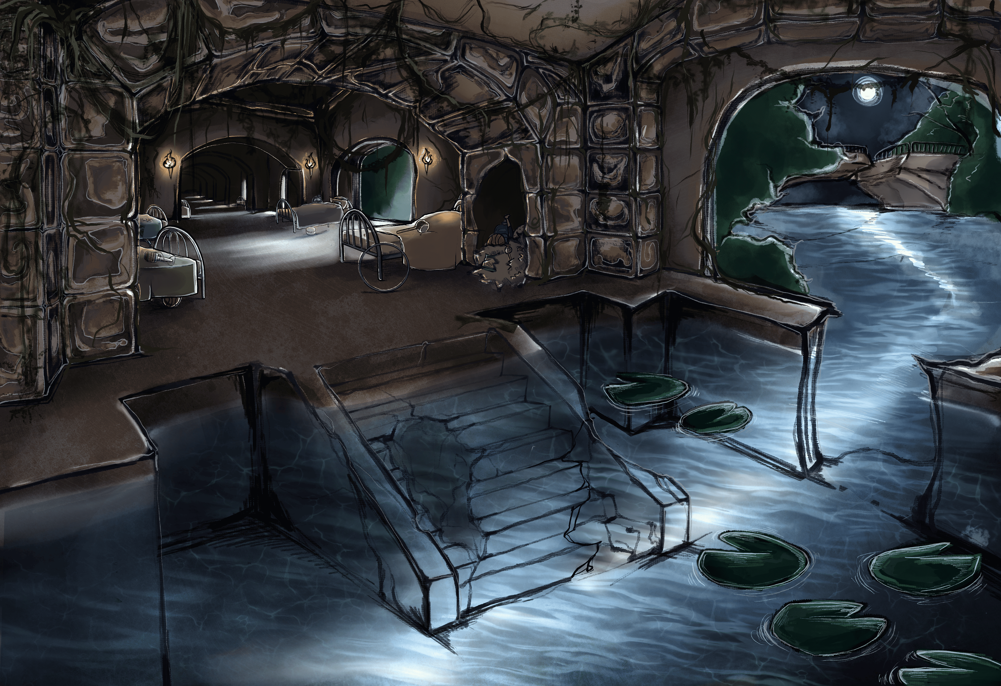 My second piece is La Llorona’s hideout, where she brings the children, having them sleep for eternity as sleeping children can’t run away, can’t harm themselves. She leaves them presents of random things she finds on the streets, placing the gifts beside them. The location itself is an old pathway that has long since been abandoned due to a bridge breaking down in a secluded park, leaving it the perfect isolated location.