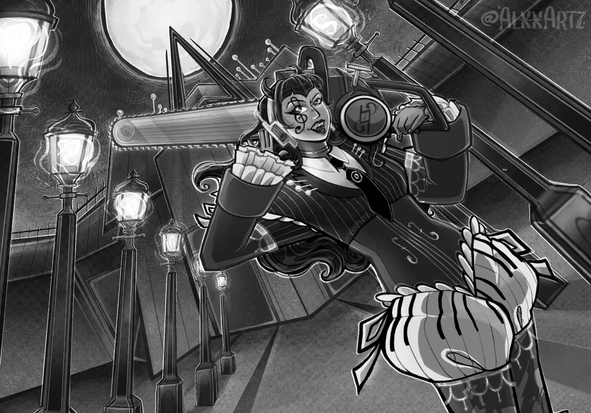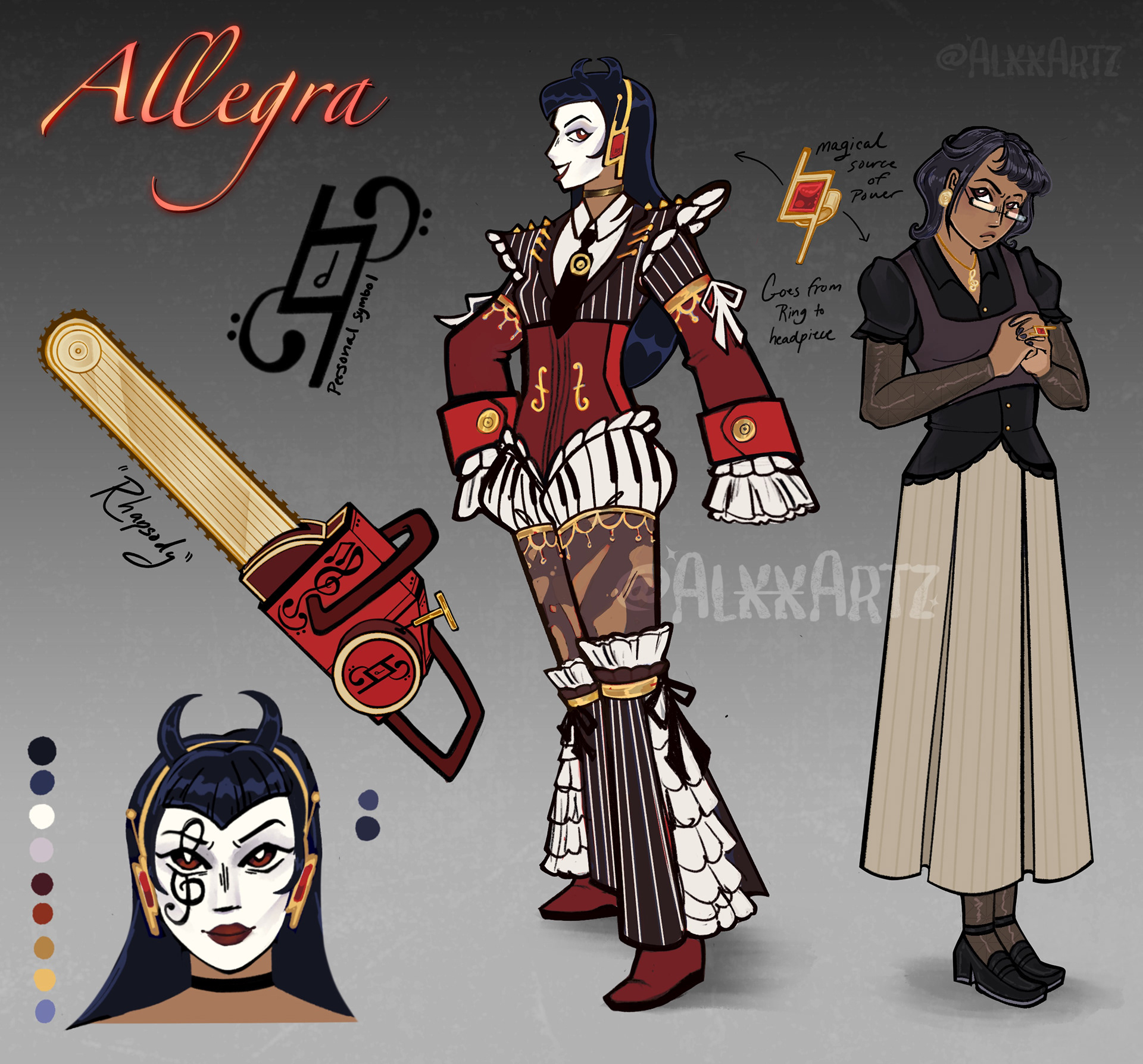 Here’s my piece for this month’s illustration collab between me and several of my artist friends — all starlight, spells, and girl power. For my magical girl “Allegra”, I originally came up with her weapon first. I knew I wanted this fun chainsaw to be the weapon, and then I slowly weaved in some musical inspiration, something something about how anything can sound like music to the right ear; even chainsaws. I wanted to do a fun sort of screencap moment to showcase Allegra’s personality and the kind of world I imagine she’d live in.
